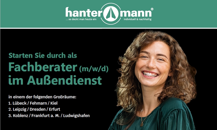 Musterkoffer auf und zu ist nicht unsere Philosophie. Wir suchen Menschen, die mit Leidenschaft und Herz ihre Kunden authentisch beraten. Als offensives Mitglied und wichtiger Teil in unserem Außendienst-Team profitieren Sie von dem Branding-Knowhow im Hause Hantermann mit einer konsequenten Corporate-Design-Vertriebsphilosophie.